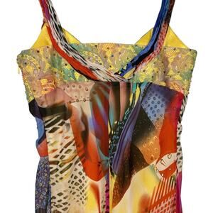 • Features: 100% Silk, Side Zip, Layered, Sequin Embellished, Sleeveless, Multicolor, Abstract Print, Long, Twist Front