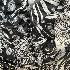 Elegant and unique, this Alberto Makali silk dress features a bold black-and-white paisley and mixed-print pattern. Designed with a wrap silhouette, ruffled hemline, and 3/4 flutter sleeves, it’s a perfect piece for cocktail parties, dinner events, or chic daytime looks.