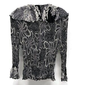 Alberto Makali black w/white floral ruffled crepe long sleeve blouse, Size M