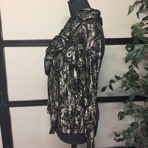 This is size M but it feels more like a current size S, I bought it several years ago, maybe wore it once. It is in great condition. The material is medium thickness good to wear in fall and spring. It feels soft and comfortable to wear.