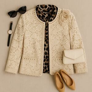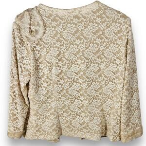 💬 Beautiful poly/spandex lace jacket, size Medium. Tailored fit with eye-catching textures and details. In excellent condition.