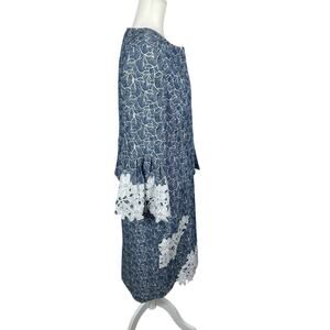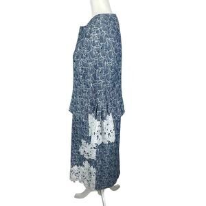 A beautiful two-piece set with floral lace applique. The coat has bell sleeves, and two hook-and-eye front closures and is fully lined. The dress is midi length, sleeveless, has a back zip and fully lined, and pockets. (small part of hem coming loose, would just need a stitch or two to keep in place). Blue and white leaf like pattern. The dress is a size 12 and the coat is a size large. Please see photos for measurements.