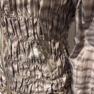 Chic bomber jacket with leopard accents. Features a stylish ruched design. Ideal for a fashionable look.