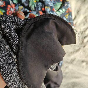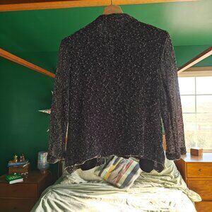 Statement shimmer blazer by Alberto Makali featuring a black and silver textured knit. Padded shoulders. Open-front draped silhouette. Perfect for evenings out, holiday events, or dressing up denim.