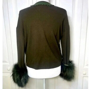 This is a stunning dark green coat. Beautiful gold accents and fur cuffs that are removable . In perfect pre loved conditions.