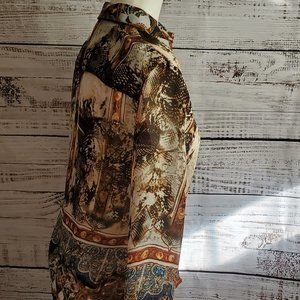 The print is a mix of floral, snake skin, art deco type of print. Colors include black, cream, blues, greens, browns.