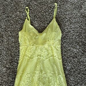 From Alberto Makali. Crochet lace. Adjustable spaghetti straps. Ribbon accent in back. Lined. Approximately 60 inches long. Approximate measurements: bust 32, waist and hips stretch. Perfect for the beach, a wedding, or anywhere you want to feel like a goddess. Designer name has been cut out. This is because it was sold at a local boutique. I looked up the RN number on the tag as shown and the designer is Alberto Makali. This beautiful bohemian boho dress is brand new with store tag.