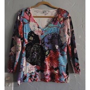 Artistic pullover by Alberto Makali, size L, featuring a vibrant abstract print with sequin embellishments on the front for a touch of sparkle. Made from a blend of viscose and nylon, the fabric is super soft and comfortable, perfect for All day wear,designed with a V-neckline and long sleeves, this Top is ideal for a chic casual Look.