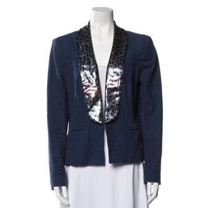 Alberto Makali Women 14 Sequined Lapel Blue Wool Blend Evening Jacket Open Front