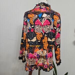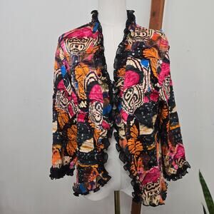 Alberto Makali jacket, boho ruffle cardigan, butterfly print top, artsy statement jacket, crinkle mesh jacket, vintage boho topper, festival wear, colorful jacket, eclectic fashion, women’s XL cardigan, Makali artwear, BohoChic, StatementTop, RuffleJacket, ArtisticPrint, ColorfulStyle