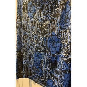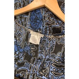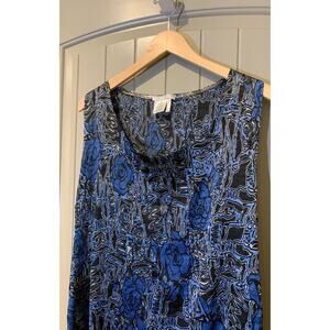 Alberto Makali sleeveless blouse, blue rose print. Polyester, textured, ruched material. Size XL.