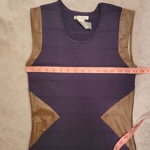 navy bandage dress with brown faux leather trim