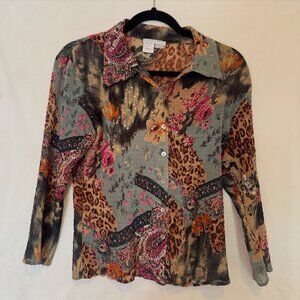 Alberto Makali sequined crinkle animal print button down top S/L