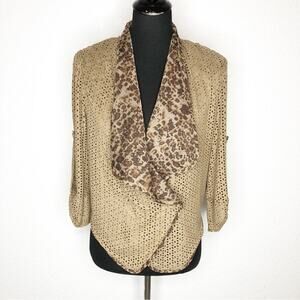 Alberto Makali brown laser cut faux suede jacket. Fold over collar with animal print. Wrap style front buttons. Laser cut faux suede material. Fully lined except sleeves. Roll tab button sleeve cuffs. Elastic back waistband. Size Medium. Polyester spandex blend.