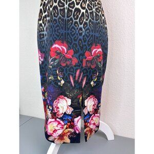 Alberto Makali brand women's size medium fitted v-neck dress. In great pre-owned condition, only flaw is a little bit of deodorant marks under the arm, I have not tried to remove. Attached belted dress is a form fit with a great stretch. Beautiful animal print into floral ombré. Lined with a slit in skirt. Zipper closure back.