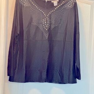 This elegant soft faux leather like top by Alberto Makali features a striking graphic embellishment around the V-neckline, crafted from metallic studs or sequins. The soft, faux draped fabric in a sophisticated hue offers both comfort and style, making it a standout piece for any occasion.