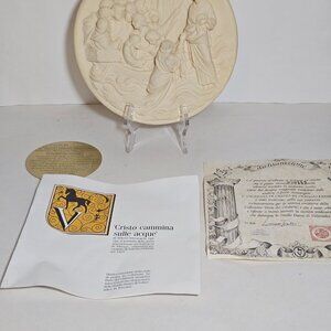 The Alberto Santangela "Christ Walks On Water" 3D collector plate is a beautifully crafted religious collectible piece from Italy. This intricate plate features a 3D depiction of Christ Walks On Water, making it a meaningful and decorative item for those who hold Christianity as their faith. Although not handmade, this alabaster plate showcases the artistry and craftsmanship of Italian religious artifacts. Perfect for collectors or individuals looking to add a touch of spirituality to their home decor
