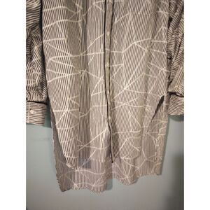 front is a little bit shorter than the back can be worn tied in the front tucked in open like a jacket looks great with leggings jeans or shorts