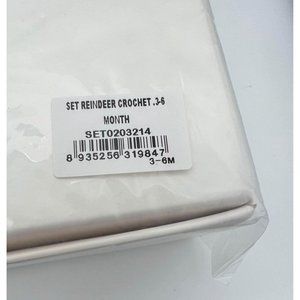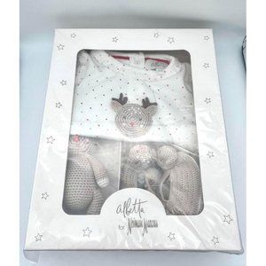 Albetta for Neiman Marcus sweet crochet Reindeer set, includes a piece of clothing with crocheted reindeer detail (probably onesie, but not sure because the item is unopened), two crocheted booties, and crocheted stuffed animal. New in box.