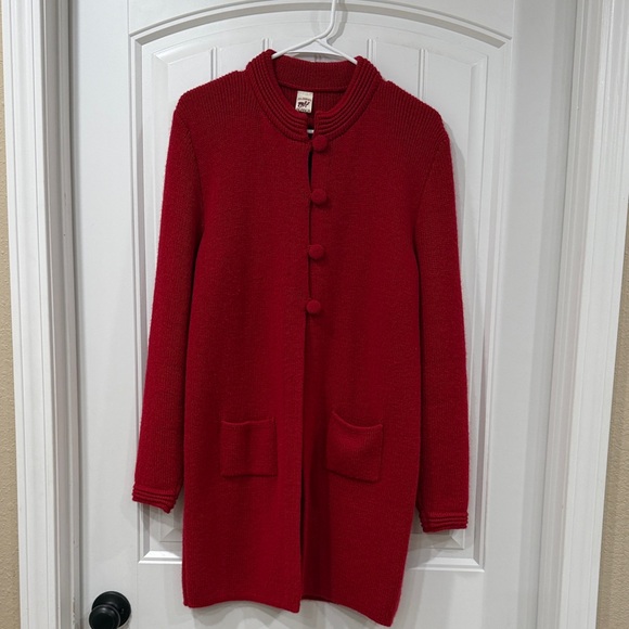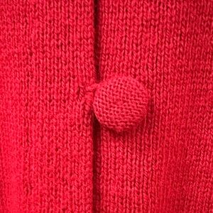 Stylish red handmade Albinas Alpaca wool cardigan featuring button details and front pockets. Excellent condition! Fits like a large.