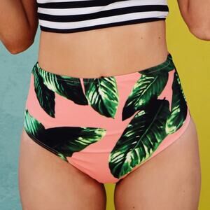 Albion IZABAL HIGH-WAISTED BOTTOMS, Size XS, Coral Pink with Green Tropical Leaf Print, High Waist, High Waisted, high Rise