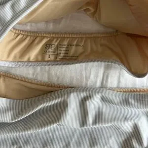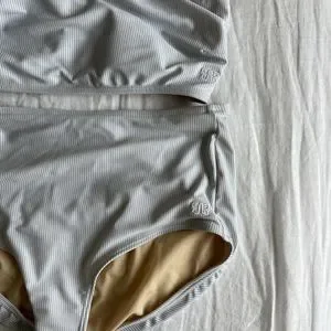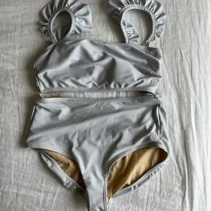 Albion two-piece bikini in white and blue striped fabric. Features ruffle shoulder straps and bandeau-style top. High rise bottoms with matching texture.