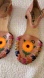 Gorgeous leather sandals with vibrant floral embroidery. Features a sunflower design and colorful accents.