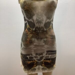 Long shirt/mini dress with sublimation print. Dress does not have any lining and is transparent. Bottom thick band. Made in USA. No size tag but best fits a size small. Can be worn as a cover up, shirt or a dress.
