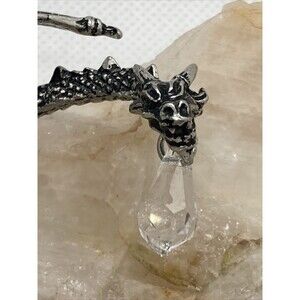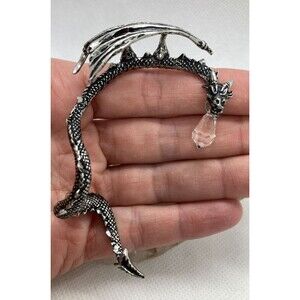In a timeless scenario of bestial supremacy, the writhing dragon flaunts its crystal treasure with dramatically outstretched wings. An elegant piece for the dark hearted. A highly animated pewter dragon faux-piecing wraps about the ear, clutching a suspended crystal dropper.