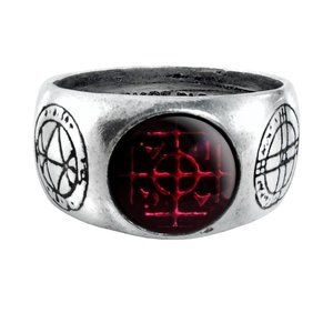 A fine English pewter band unisex ring engraved with magical talismans, with the central one beneath a translucent red enamel. .94" wide, comes in sizes 7, 8.5, 9.5, 11