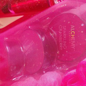 Sheer mesh zipper bag with 3 full size bath poofs and 3 body butters: Sparkling Cranberry, Sugar Strawberry, Candy Apple one ounce each.