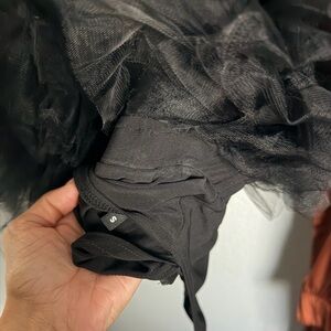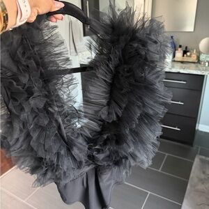 Elegant black bodysuit with dramatic ruffled design. Perfect for a bold fashion statement.