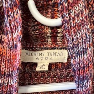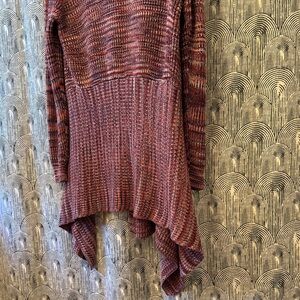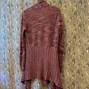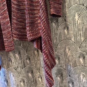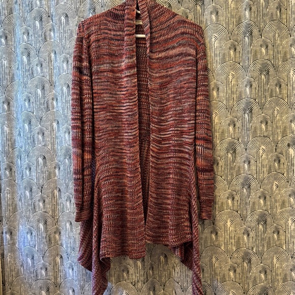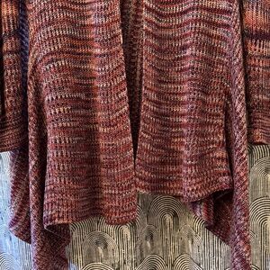 Stay cozy and stylish with this multi-colored open-front sweater/wrap. Perfect for layering, this sweater adds a touch of elegance to any outfit. Front/back length from shoulder is 31 in, side are a bit longer at 39 in. Size is S.