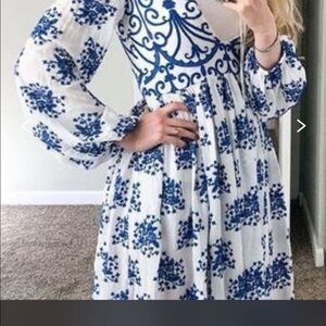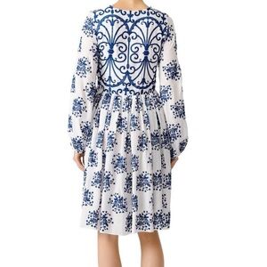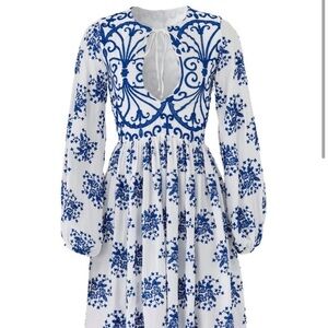 White and blue printed cotton (100% Cotton). Hourglass. Long sleeves. V-neckline with plunging keyhole detail. Elastic waistband. Fully lined. 39.5" from shoulder to hemline.