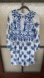White and blue printed cotton (100% Cotton). Hourglass. Long sleeves. V-neckline with plunging keyhole detail. Elastic waistband. Fully lined. 39.5" from shoulder to hemline. Imported.