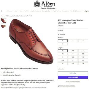 Alden 962 Norwegian Front Blucher Burnished Tan Calf Leather Mens 11 Dress Shoes