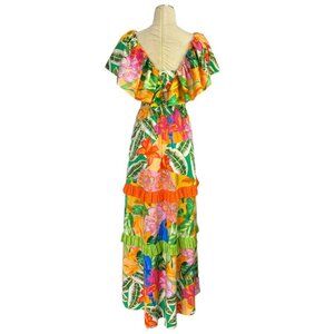 Alden Adair Camilla dress in Santiago print. New without tags. Beautiful, well-made dress with a tiered skirt and ruffled V-neck. Jungle tropical print with parrots. Hem is higher in front than in back. Perfect for vacation, resort, travel, wedding or special occasion. Please see pictures for more details and measurements. Measurements in photos are for an XS. Message me if you need measurements for the small. Alden Adair is a woman owned company that offer unique prints and feminine styles.
