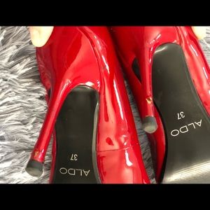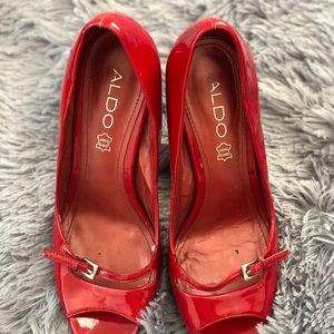 Red patent leather peep toe heels. Small blemish on both heels as shown in photo.