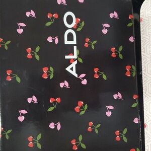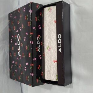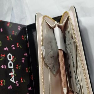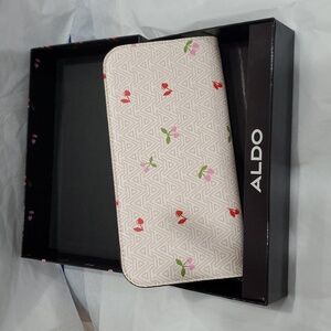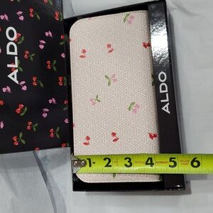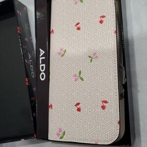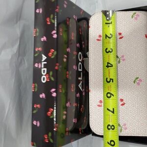 Aldo A monogrammed red pink heart shaped cherry stem zip around wallet new in black cherry print glossy box