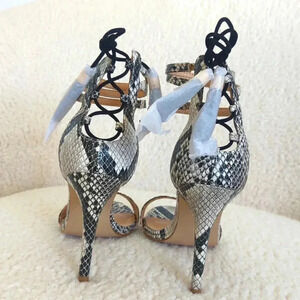 Aldo Adeladien Snake Print Strappy Heels. Featuring adjust tie back with tassels. Leather.
