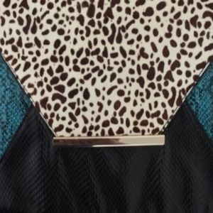 Aldo Animal Print Media Envelope Clutch. Cream and Brown Cheetah Print on Pony Hair, Turquoise Snakeskin, and Black Snakeskin Outer. Black Fabric Liner with Single Zipper with tassel.