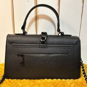 Stylish black crossbody bag with chain accents. Features a playful charm and sleek design. Perfect for everyday use.