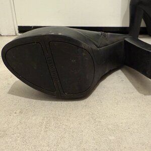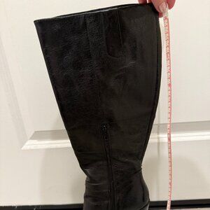 Aldo brand, size 7 1/2, black, knee-length leather boots. Four inch heel, external zipper on inside of boot.