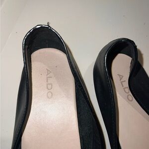 These Aldo flats feature a sleek black leather exterior with a minimalist slip-on design, perfect for versatile wear. The smooth leather uppers and rounded toe offer a classic look, while the soft interior lining ensures comfort for both casual and business occasions.