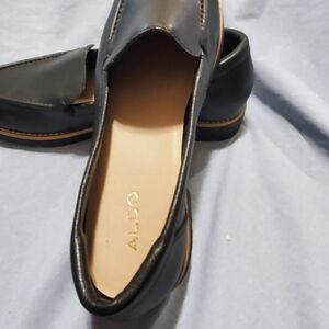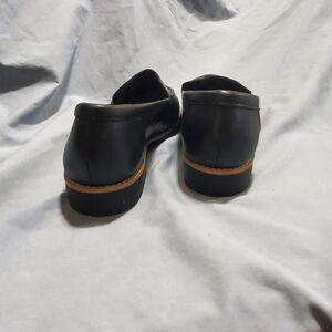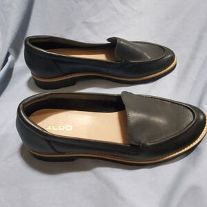 Elegant black leather loafers by Aldo. Features a stylish tan sole. Ideal for versatile wear.