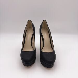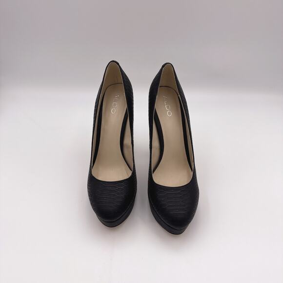 Elevate your evening ensemble with these stunning Aldo platform pumps. Featuring a sleek black faux-leather upper with a realistic snakeskin-embossed texture, these heels deliver high-impact style. The design includes a rounded toe and a towering stiletto heel, balanced by a substantial hidden platform for added height and stability. Whether you're heading to a cocktail party or a formal event, these shoes provide a polished, fierce look. They are in excellent pre-owned condition with minor signs of wear on the outsoles.