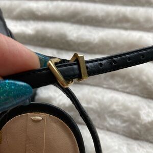 Chic and versatile black ALDO block heel sandals featuring a stacked 3.5” heel and faux snakeskin trim across the toe strap and heel. Ankle strap with gold buckle closure adds a secure fit and classic finish. Gently used condition with light wear on soles and minimal signs of use near the inner heel strap (see photos). Perfect for pairing with dresses, jeans, or evening outfits.