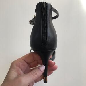 Gorgeous black strappy heels. A wrap around strap gives an ethereal look to a chic closed toe heel set a on high stiletto heel. Gold detail on the heel. The perfect dancing shoes for those who dare.