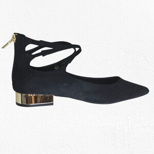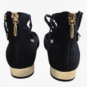 Aldo Black Suede Marieta Lace-Up Flats Gold Heel Zip Ballet Shoes Size 6.5 NWT