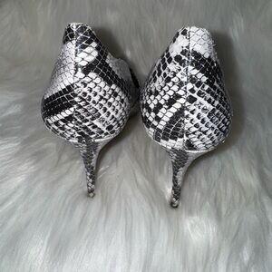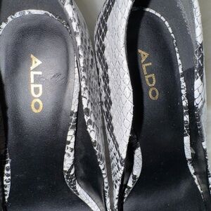 Elevate your style with Aldo's sophisticated heels, featuring a striking black and white snakeskin pattern. These pointed-toe pumps offer a sleek silhouette and a medium-height heel, perfect for adding a touch of elegance to any ensemble. Crafted with a textured finish, they seamlessly blend exotic flair with timeless design.